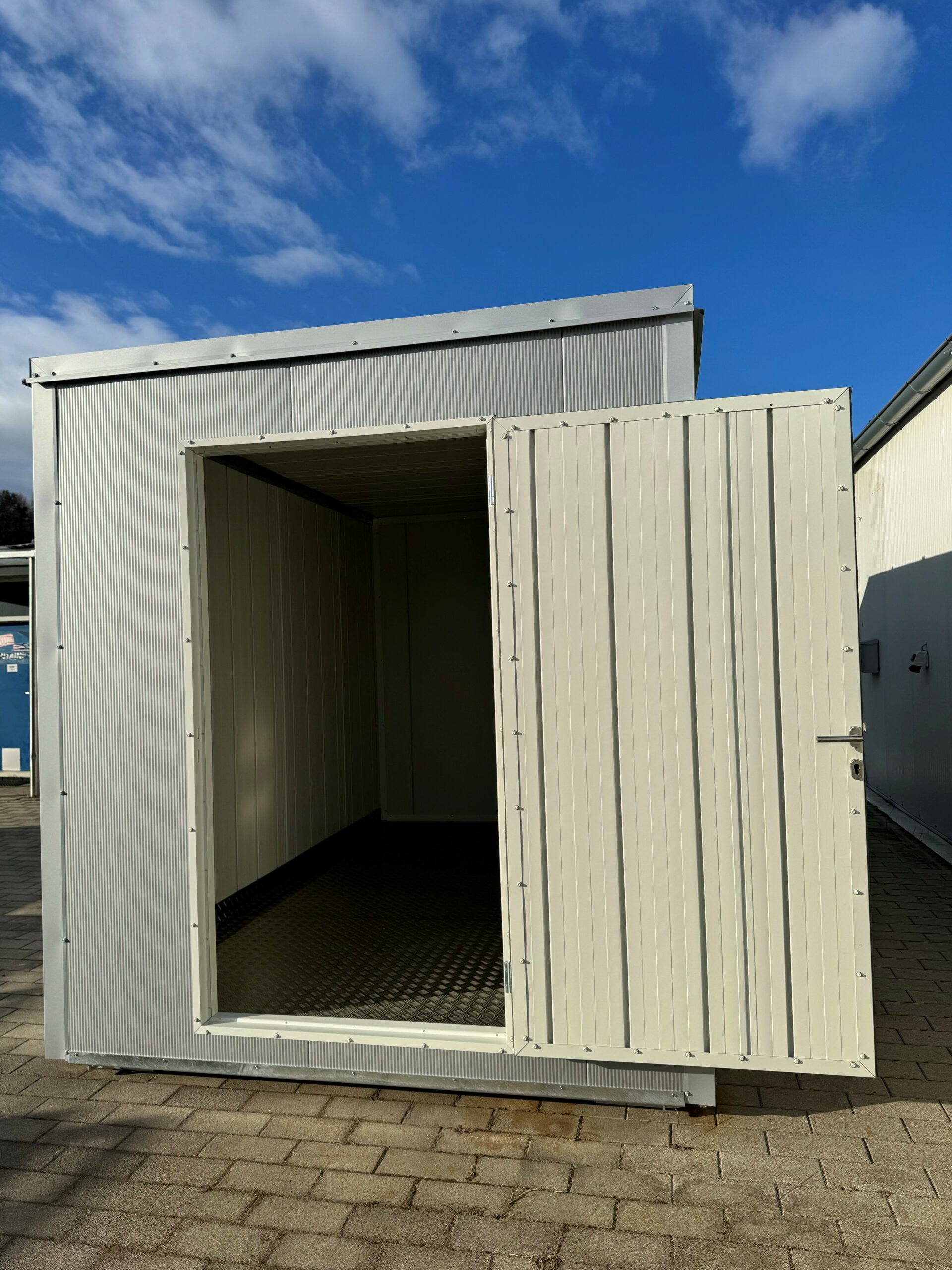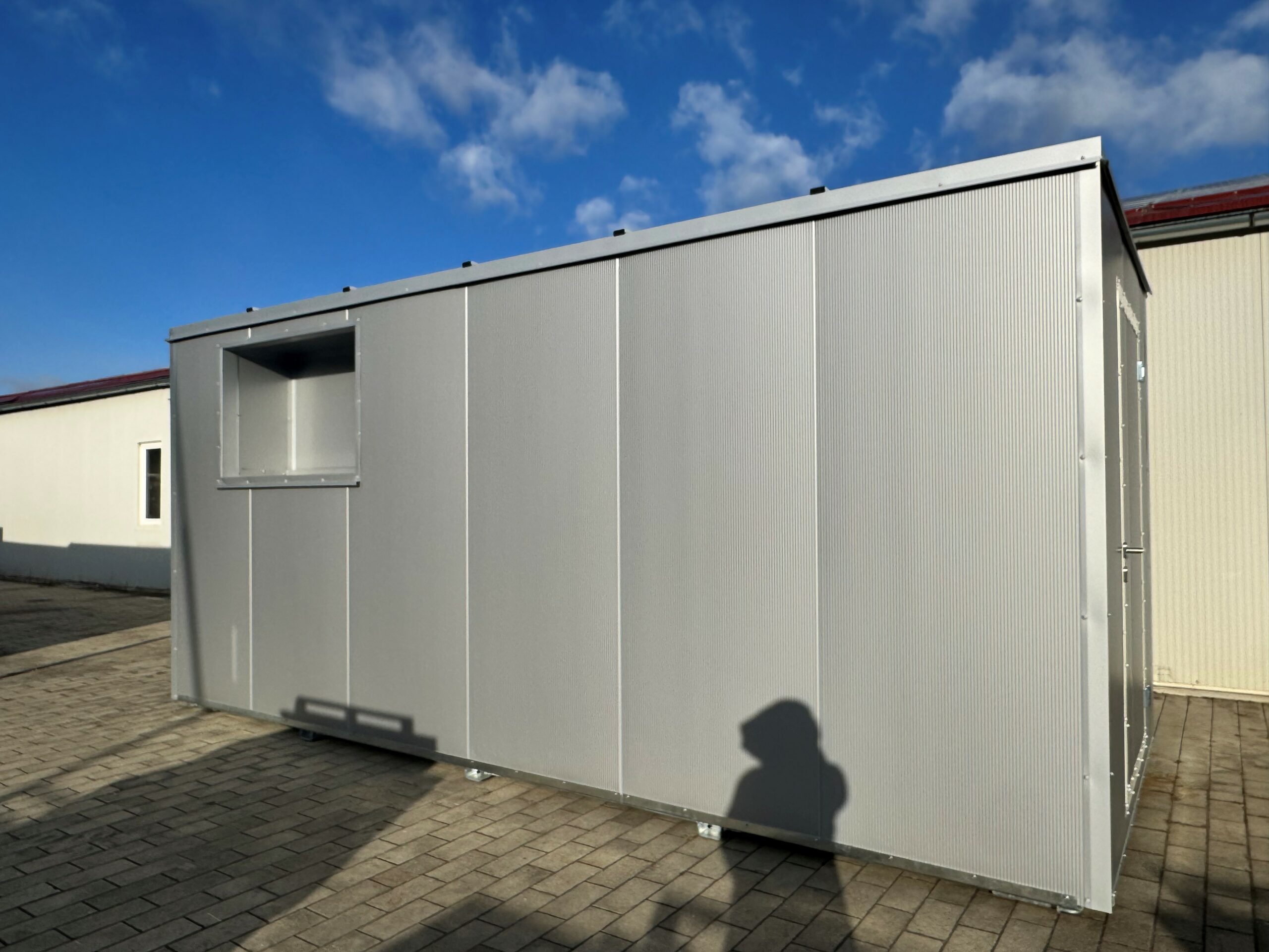 Durch das modulare Konzept lassen sich bestehende Einheiten jederzeit erweitern oder an neue Nutzungen anpassen – z. B. vom Geräteschuppen zum isolierten Lagerraum oder vom Containerbüro zum Verkaufsraum.