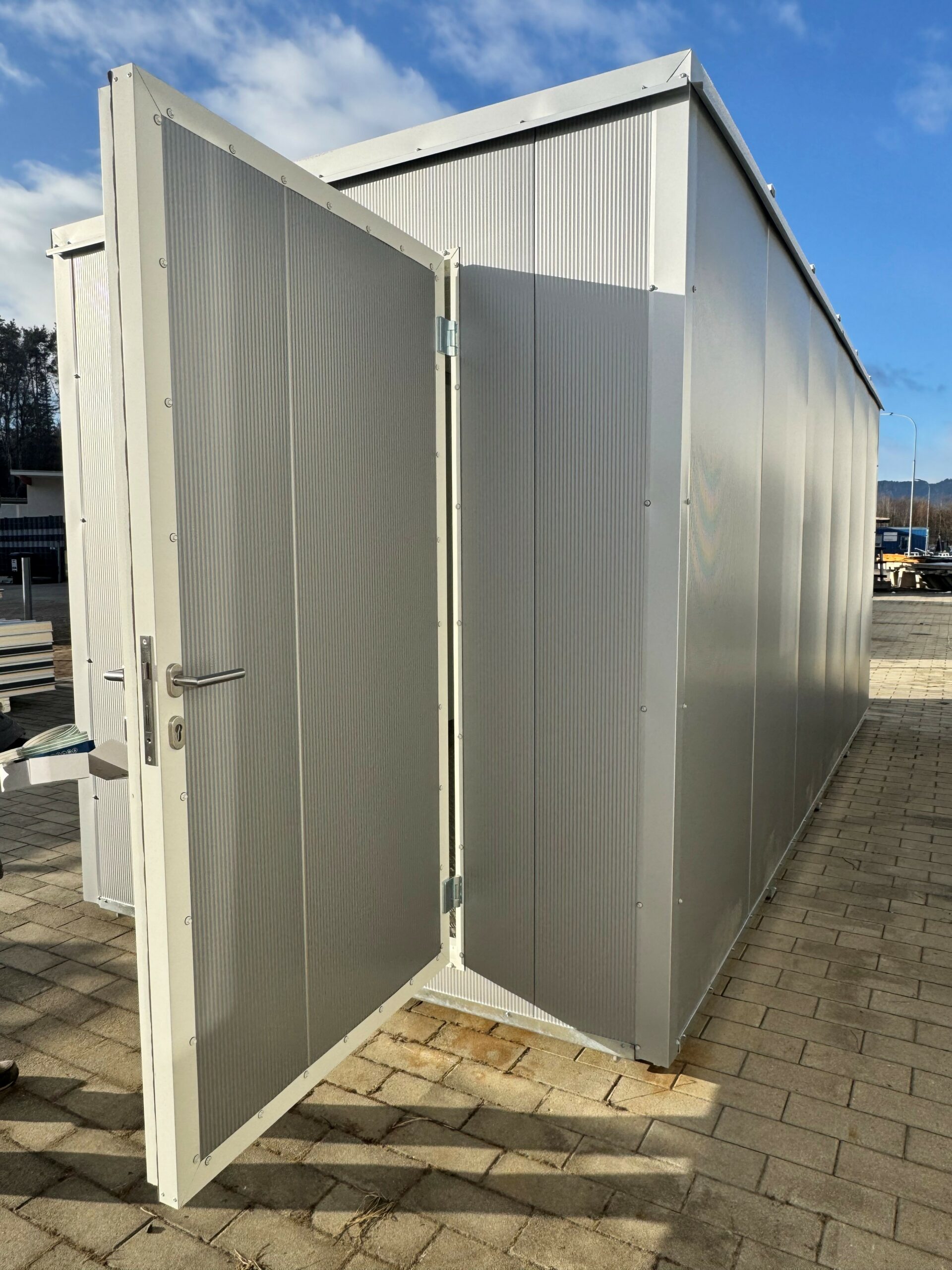 Standardmäßig werden Türen aus HDD-Sandwichpaneelen verbaut. Diese bieten eine einheitliche Optik und gleichbleibende Dämmwerte – ideal für BürocontainerGartenhäuserSchrebergartenhäuser und mobile Verkaufsräume.